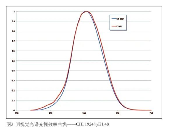 可见,这3条曲线全都得到了修正。与之前相比,人眼对蓝光、红光的敏感度得到显著体现,对深蓝光的敏感度也得到进一步增强。多年来,涌现出许许多多的明视觉曲线V(λ)建议版本,它们都在CIE 1924曲线基础上取得了重大进步。一个研究团队综合了很多研究成果,再结合已知的人眼生理结构,提出一项新的方案。CIE准备采用这条曲线,把它命名为CIE 2012,《ANSI E1.48–2014舞台、演播室灯光用明视觉光谱光视效率函数》推荐性标准(ANSI E1.48 – 2014, A Recommended Luminous Efficiency Function for Stage and Studio Luminaire Photometry)中给出了这条曲线。图3就是E1.48曲线与CIE 1924曲线。