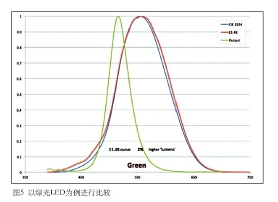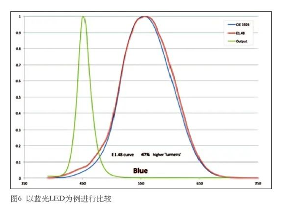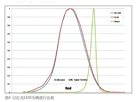 阐述CIE 1924曲线存在的缺陷,推荐采用E1.48曲线来测量光度量(特别是窄波段蓝光LED),并通过实际数据对这两条曲线进行比较分析。