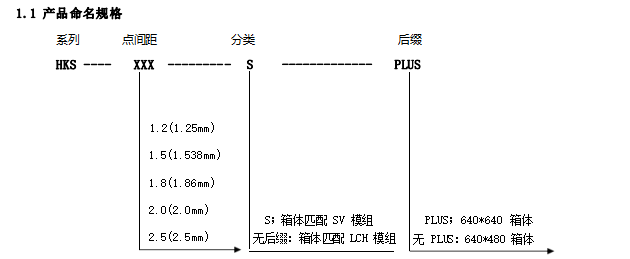 例如:HKS1.5-S PLUS 标准版 解读为:HKS640*640 系列匹配 SV 模组 P1.538 间距产品。