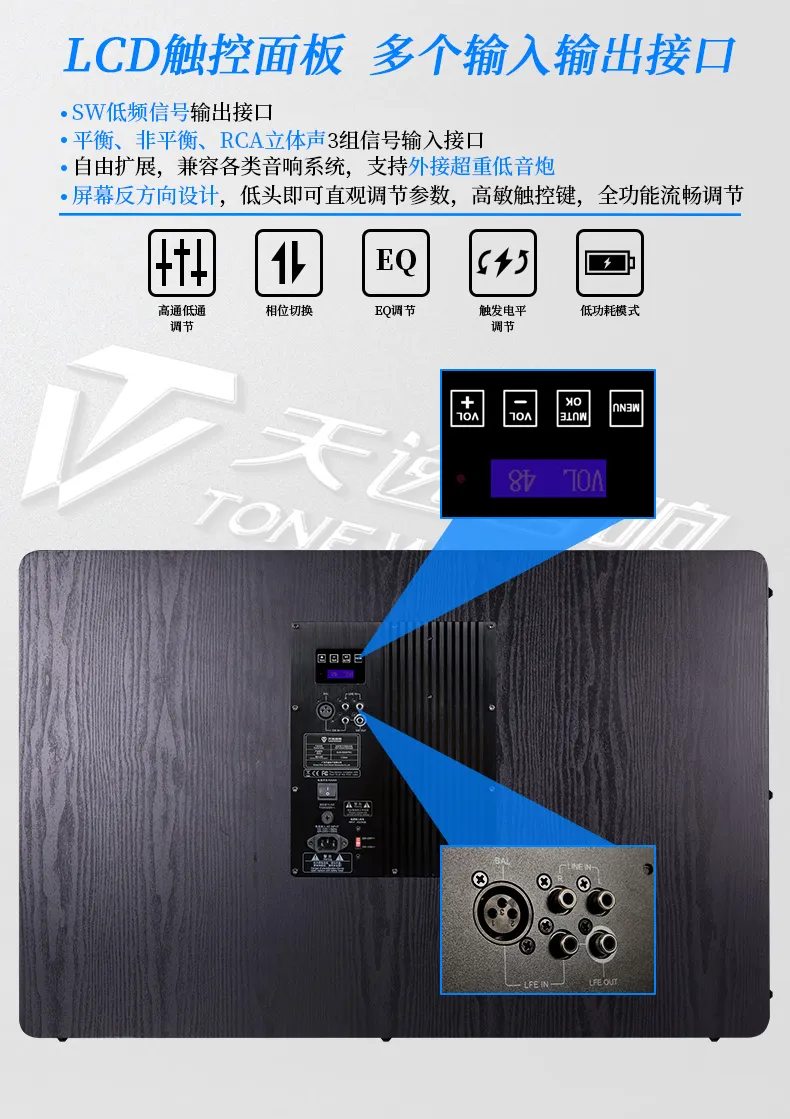 8. 支持平衡、非平衡、RCA立体声信号、低频信号输出;