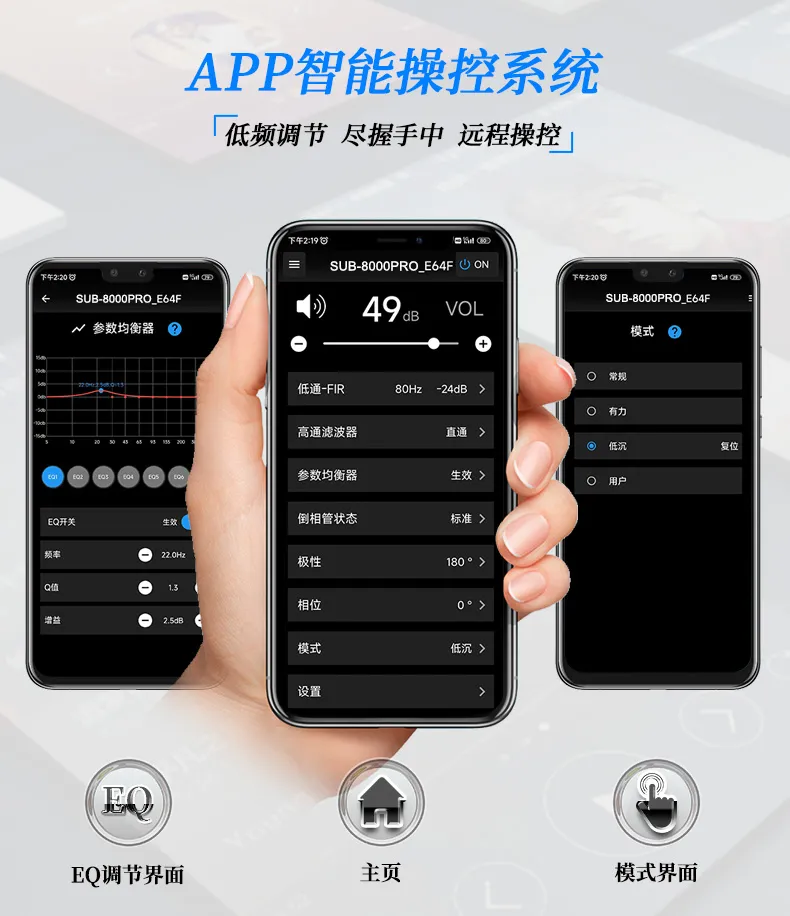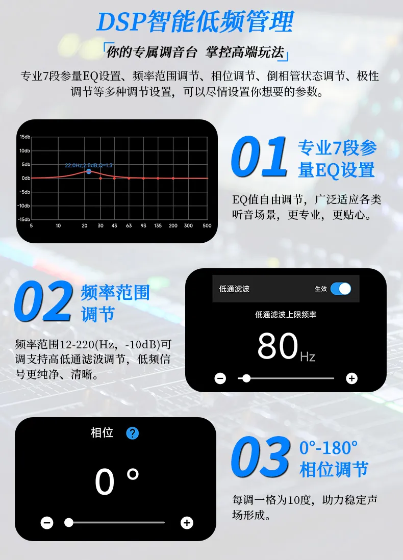 1. DSP智能低频管理:7段参量EQ设置、频率范围调节、相位调节