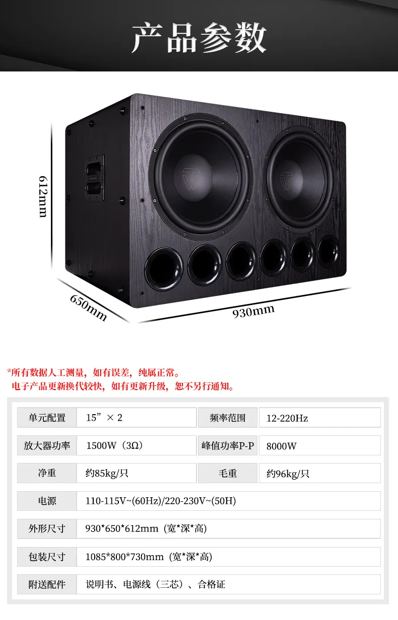 3. 功放功率达1500W(3Ω),峰值功率P-P输出可达8000W,重量高达85公斤;